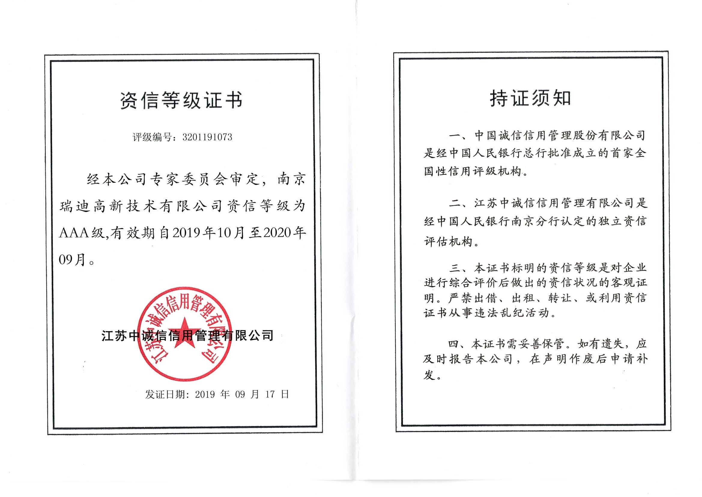 AAA 資信等級(jí)證書 |