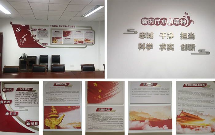 (圍繞“不忘初心,牢記使命”主題,布置入黨誓詞、黨員權利、黨員義務、黨的宗旨、黨支部基本任務和新時代水利精神的黨建主題墻。) (公司產品應用和創(chuàng)新成果展示,彰顯公司高新技術企業(yè)的特點與實力,營造創(chuàng)新驅動、科學發(fā)展、開拓進取的工作氛圍。)