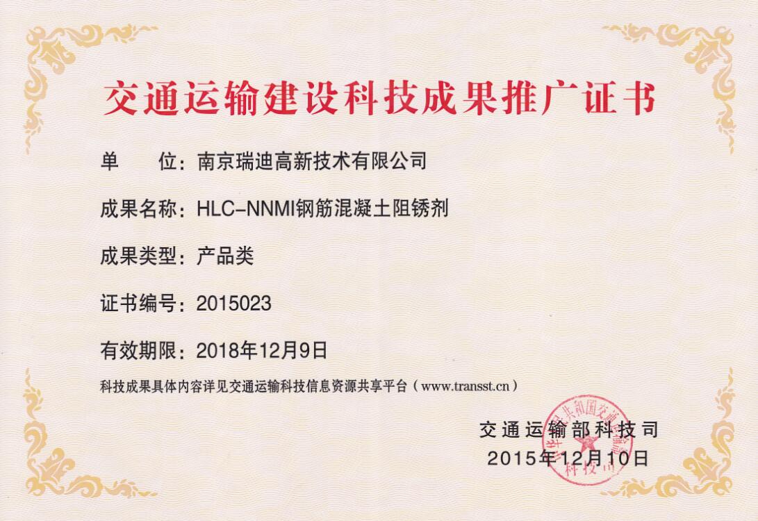 HLC-NNMI 交通運輸部科技成果推廣證書 |